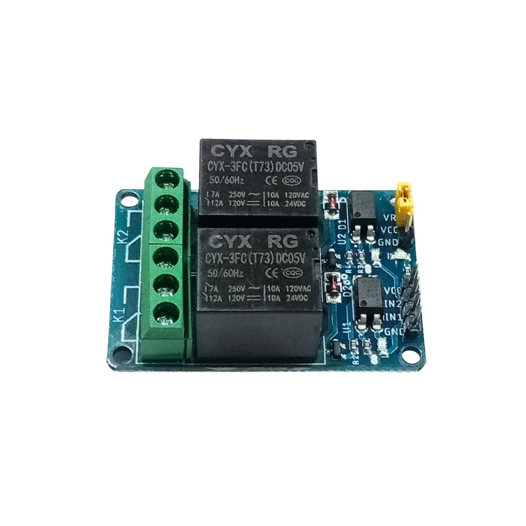 The dual-channel relay module can be used to switch mains-powered loads from the pins of the microcontroller. Since there are two channels on the same board, two separate loads can be powered. This is useful for home automation.